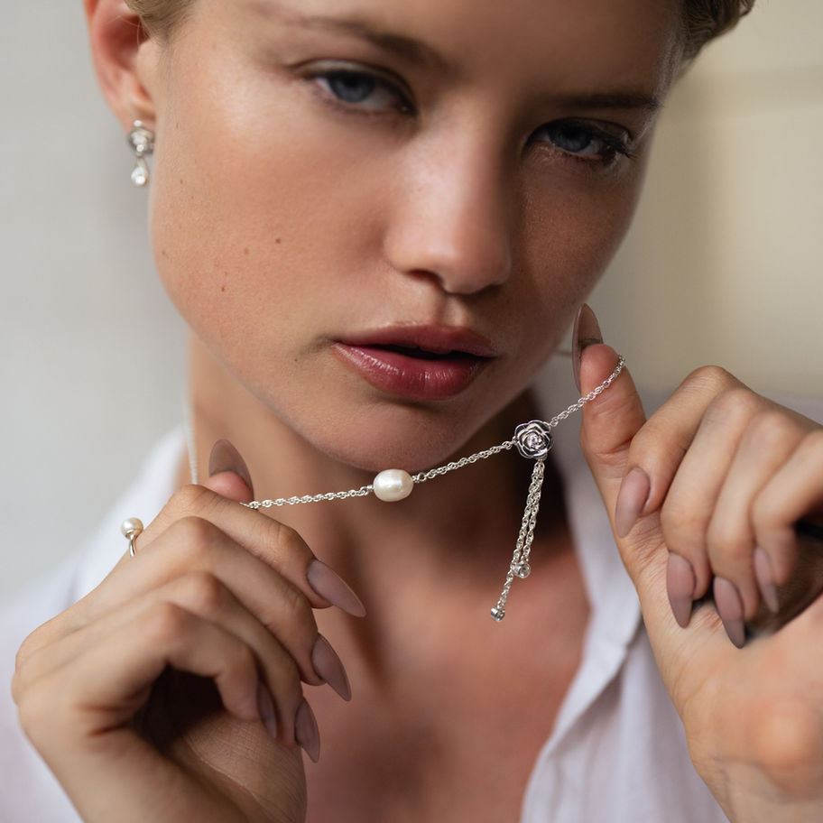 Discover the Classy Rose Pearl Silver Necklace at Lieves Jewels, a symphony of Italian design and Balinese craftsmanship. A classy string with a luminous pearl charm adorned with zircon stones and an oval-shaped pearl offers a minimalist touch with its sterling silver material and color, making it versatile for both a busy workday and sophisticated evening events. This handmade pearl jewellery blends softness and strength.